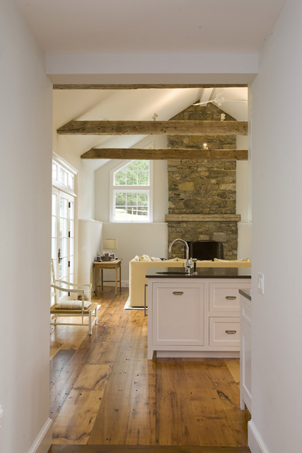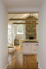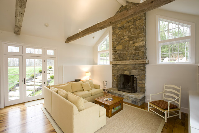 antique beams and stone fireplace punctuate the bright, loft like light filled space.