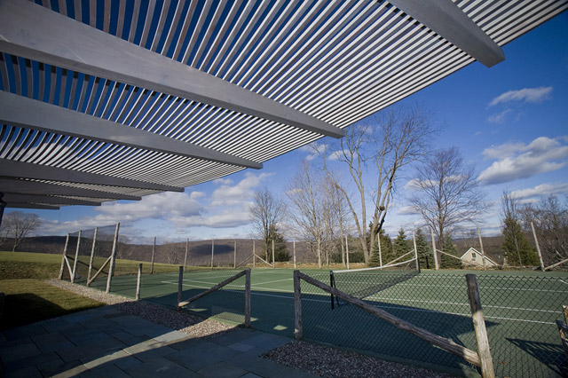 and functional. The structure lends shade to the spectator and houses tennis equipment and a beverage center .